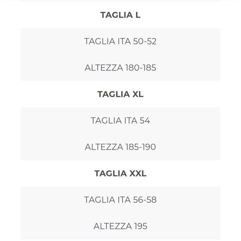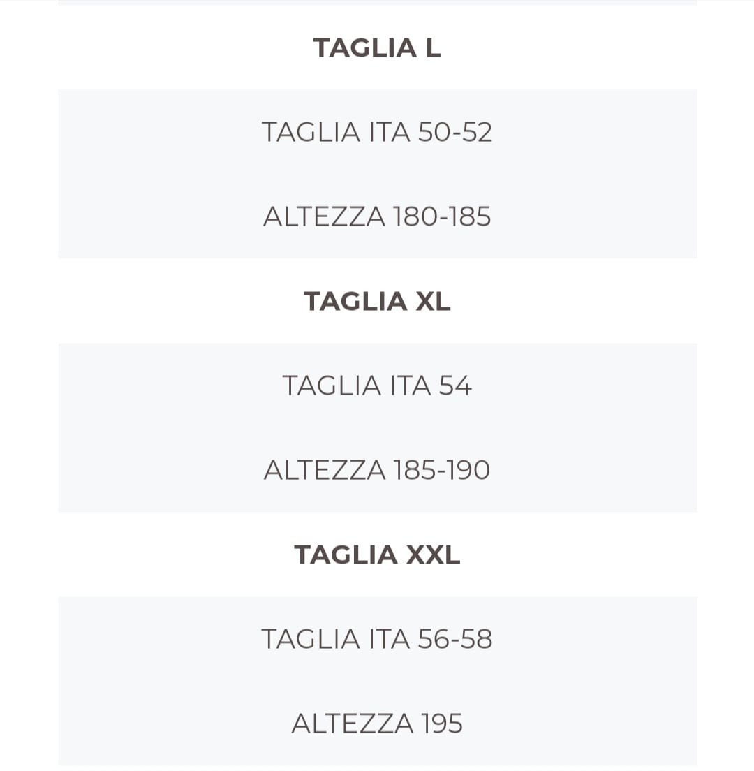 Guida taglie: Taglia L (altezza 180- 185), taglia XL (altezza 185- 190), taglia XXL (altezza 195)
