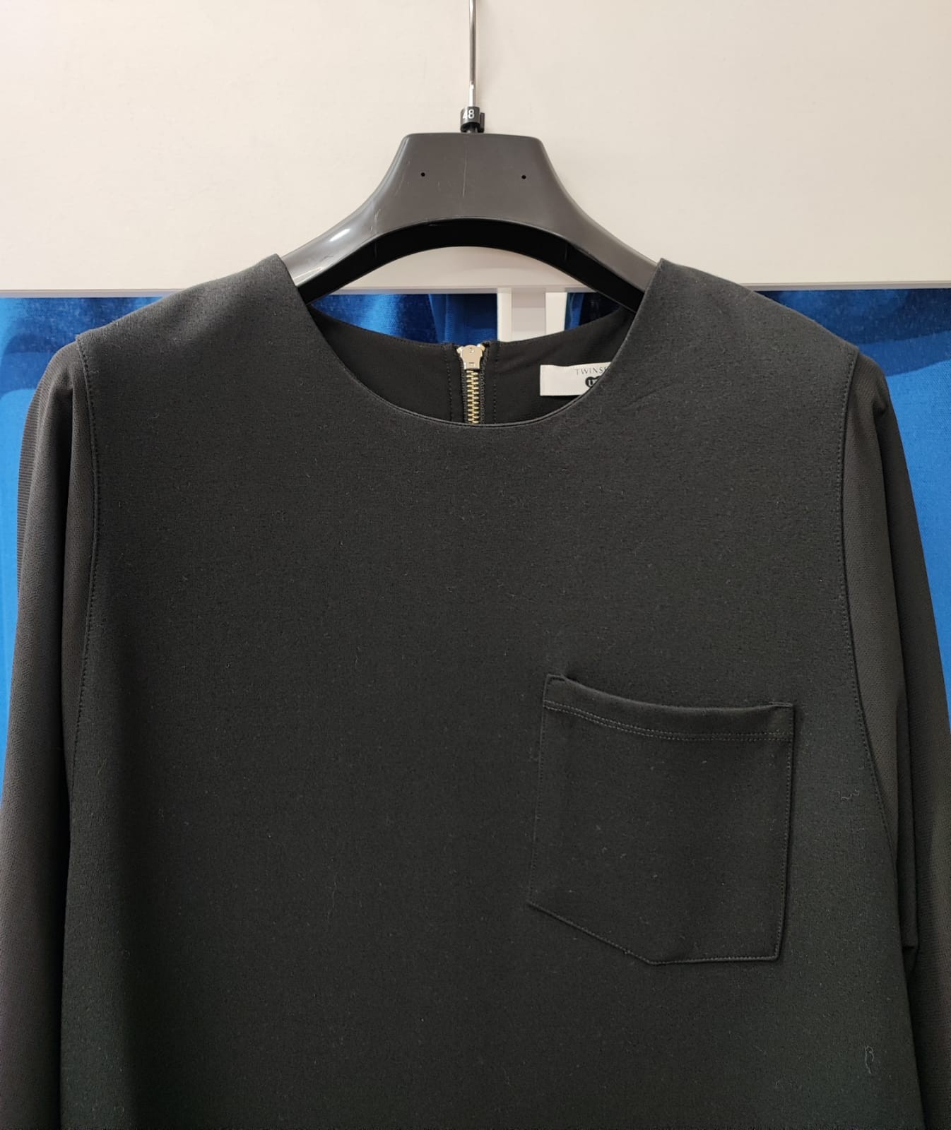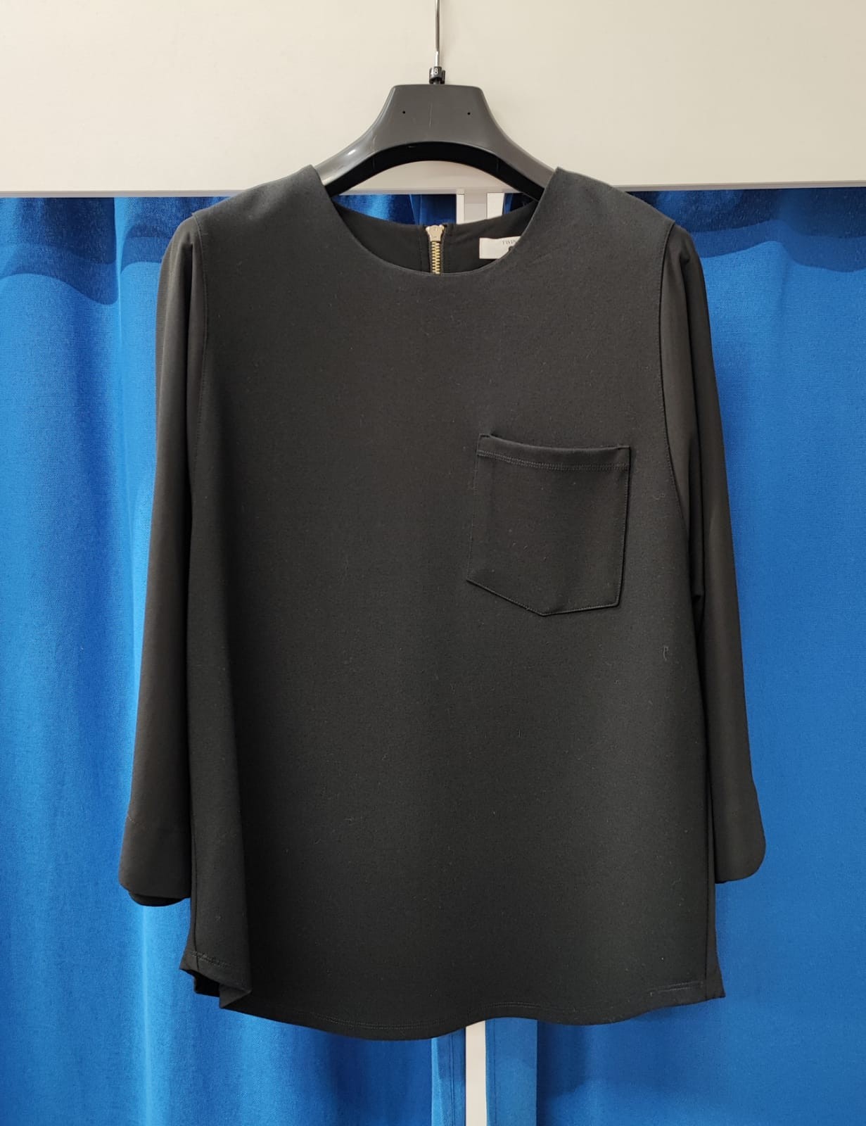 Blusa con scollo girocollo, maniche a 3/4. Possiede una tasca anteriore e una cerniera posteriore.