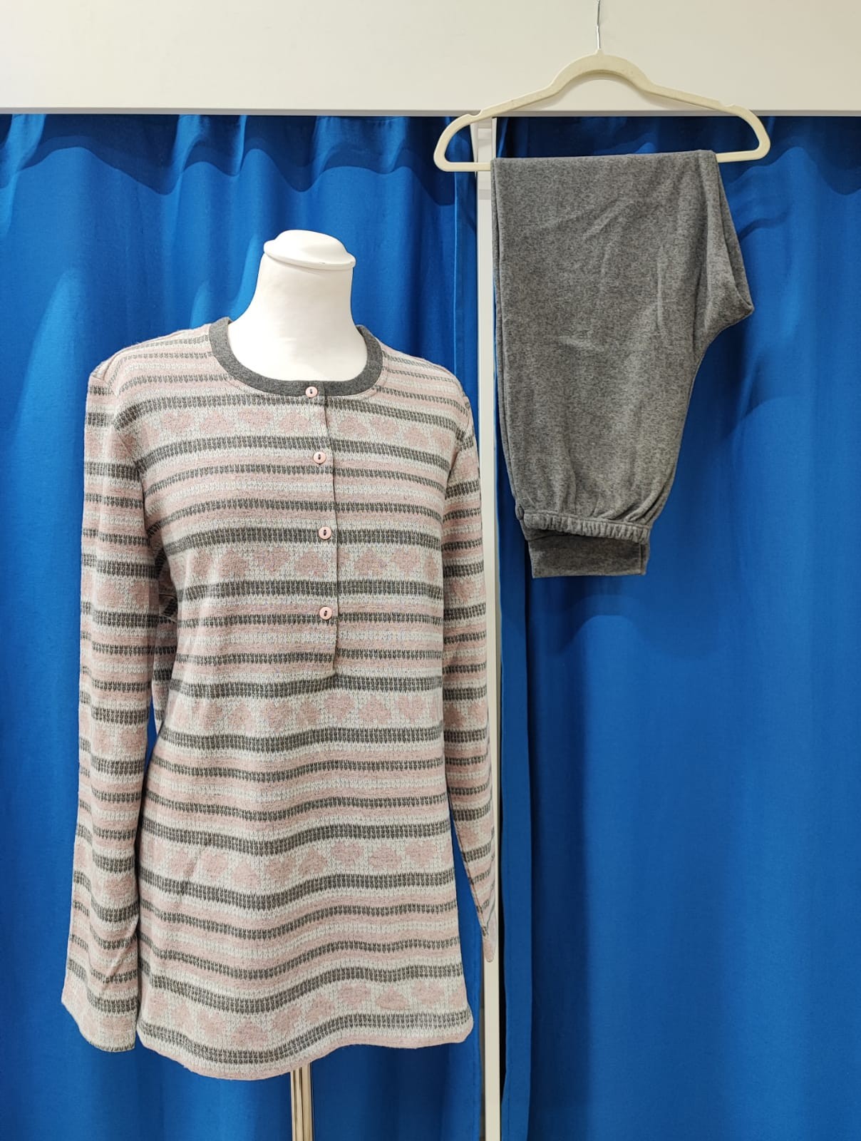 Pigiama scollo serafino. Manica lunga, pantalone lungo con polsi.