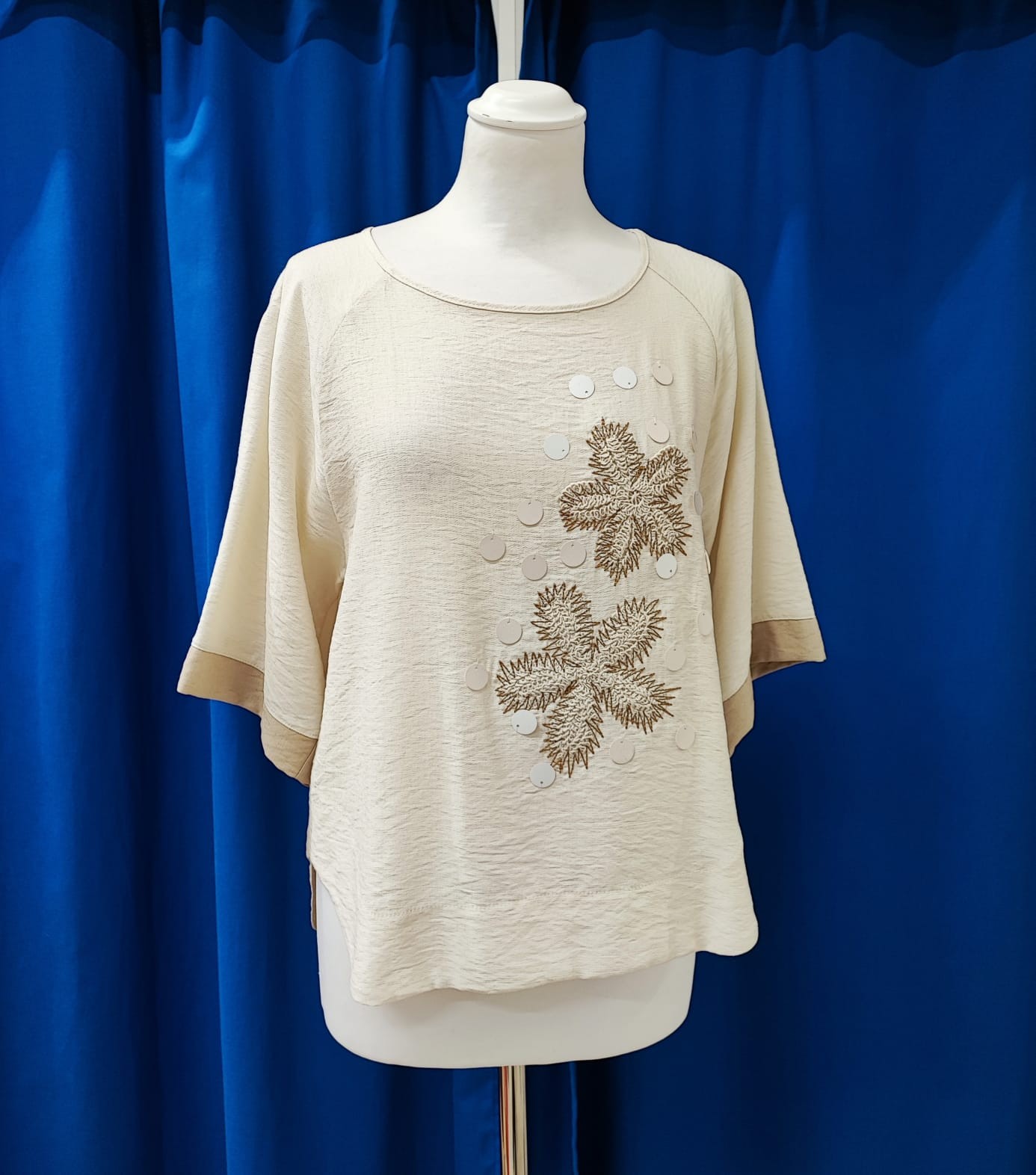 Maglia svasata, scollo girocollo. Maniche scivolate.